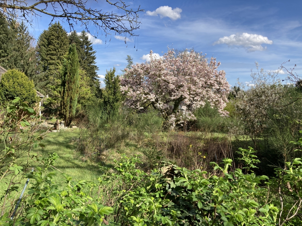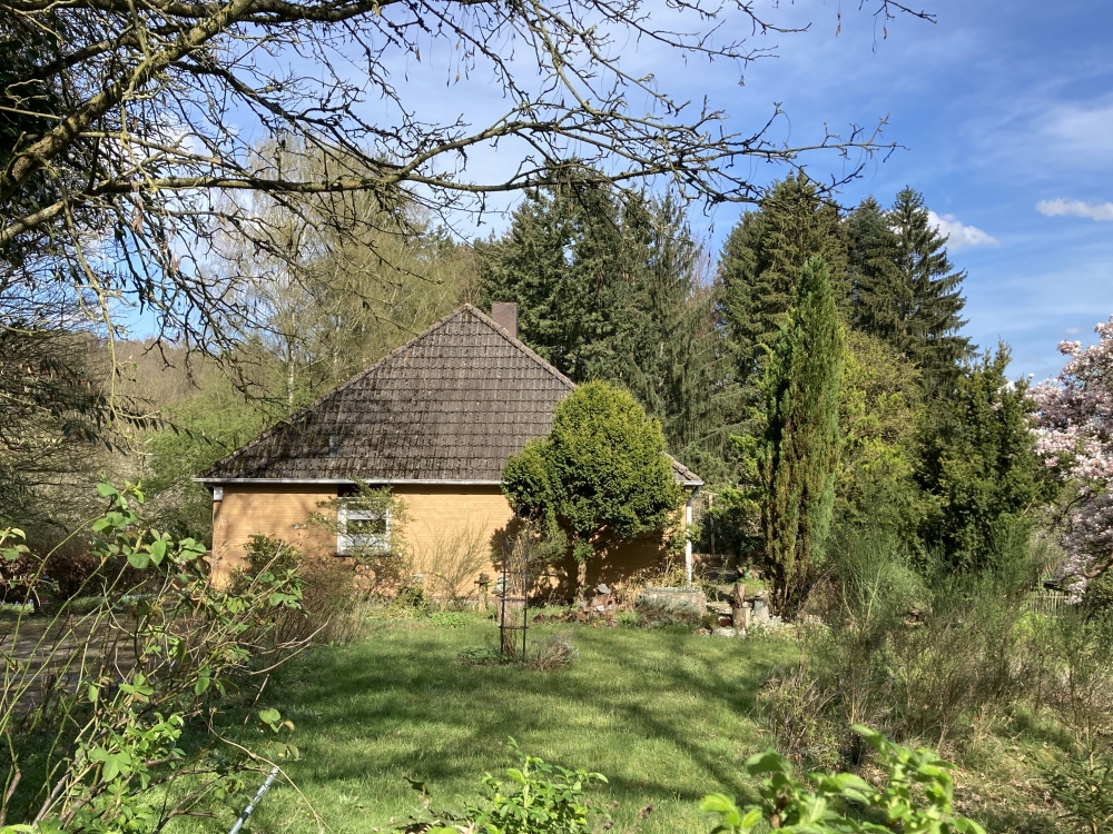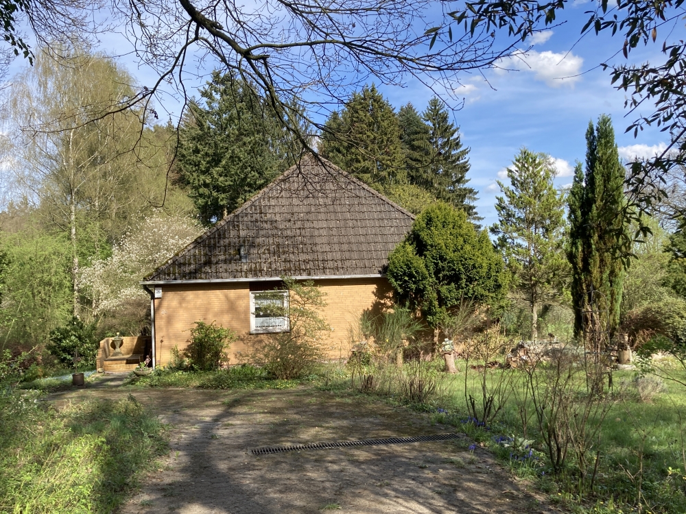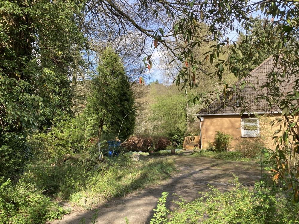 Das Grundstück mit einer Größe von 2.856 m² liegt in einer teilweise bewaldeten Wohnstraße und ist mit einem kleinen, renovierungsbedürftigen Haus (Baujahr 1971, ca. 120 m², Keller, Garage) bebaut. Das eingewachsene Grundstück mit einer wunderschönen großen Magnolie liegt ruhig und trotzdem sehr zentral.